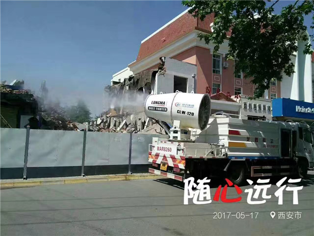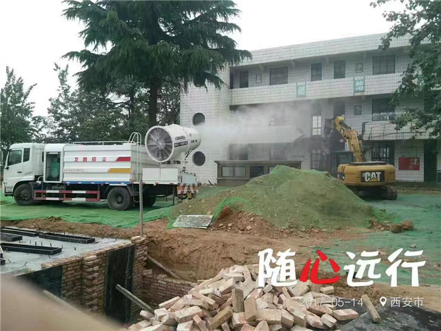 在西安經濟開發區拆遷現場,挖掘機正在進行拆除作業。“轟隆”一聲巨響,伴隨樓房倒塌,揚塵瞬間拔地而起,飛快地往上升騰,并向四周擴散。但不到10秒的時間,這漫天的揚塵就被壓制住了,以往拆遷現場揚塵四散、空氣污濁的問題得到有效解決。這得益于現場的一款環保神器——霧炮車。