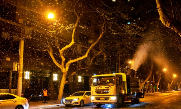 進(jìn)入四月,上海30多萬棵懸鈴木行道樹又進(jìn)入了飛絮季。為了防控果毛,今年綠化部門首次試點(diǎn)了物理沖刷技術(shù),嘗試用高射程噴霧機(jī)的風(fēng)力和水霧,把已成熟欲脫落的果毛提前吹落。 昨晚十點(diǎn),首次果毛飛絮物理沖刷試點(diǎn)在徐匯區(qū)展開。作業(yè)車隊(duì)沿著陜西南路緩慢前行,排在第一輛的程力高射風(fēng)力機(jī)車首先將巨大的風(fēng)筒對(duì)準(zhǔn)樹枝,把成熟欲脫落的果毛吹落。第二輛程力噴霧降塵車緊接著噴灑水霧將果毛降至地面,緊隨其后的第三輛高壓灑水車再將果毛集中沖到路牙邊,最后由機(jī)動(dòng)清掃車將果毛收集清掃。