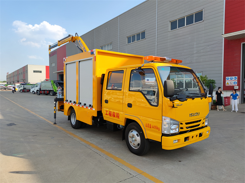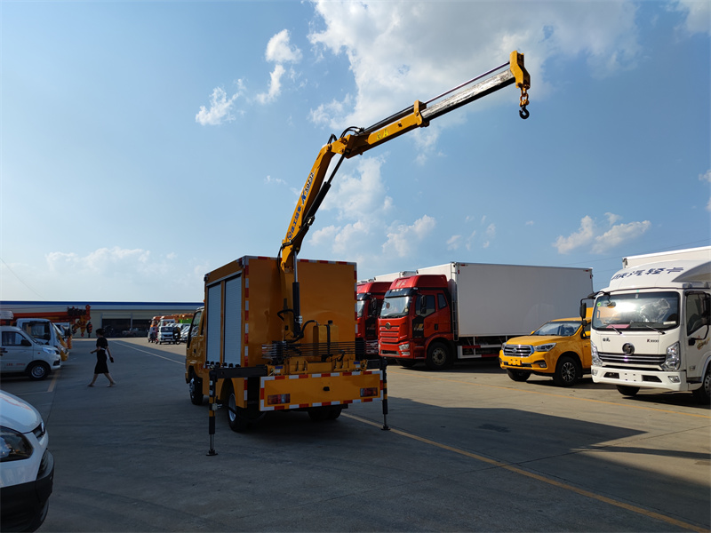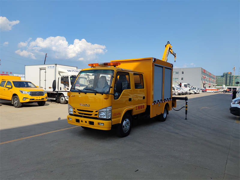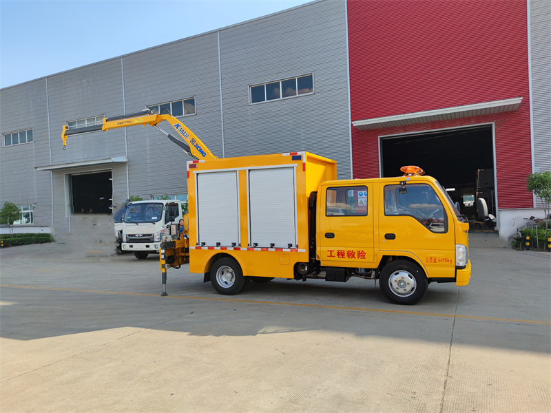 上裝配置:廂體采用專用鋼板,矩形鋼管焊接成型,內外封板,地板為花紋板,內飾鋪小花紋鋁板,廂體兩側配鋁合金卷簾門(帶鑰匙鎖)。廂體內LED,DC12V照明燈,,接地鋼釬及接地線,車載2KG滅火器及固定支架,長排警燈,專用裝置為30KW柴油發電機組壹臺,便攜式電焊機壹臺,500立方每小時大流量排水泵一臺。尾部裝二噸徐工折臂吊機,吊機型號為SQZ32,吊機最大起重質量為2000kg,工作高度7.5米,工作半徑5米。