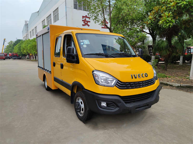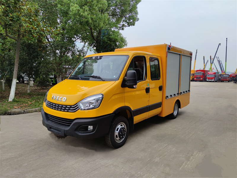 依維柯雙排救險車-流量1000方每小時,該車配備工程標識燈、發電機組、空壓機、電焊機、等離子系統等專用設備及控制系統,主要用于應急救險救援,應急排水作業。